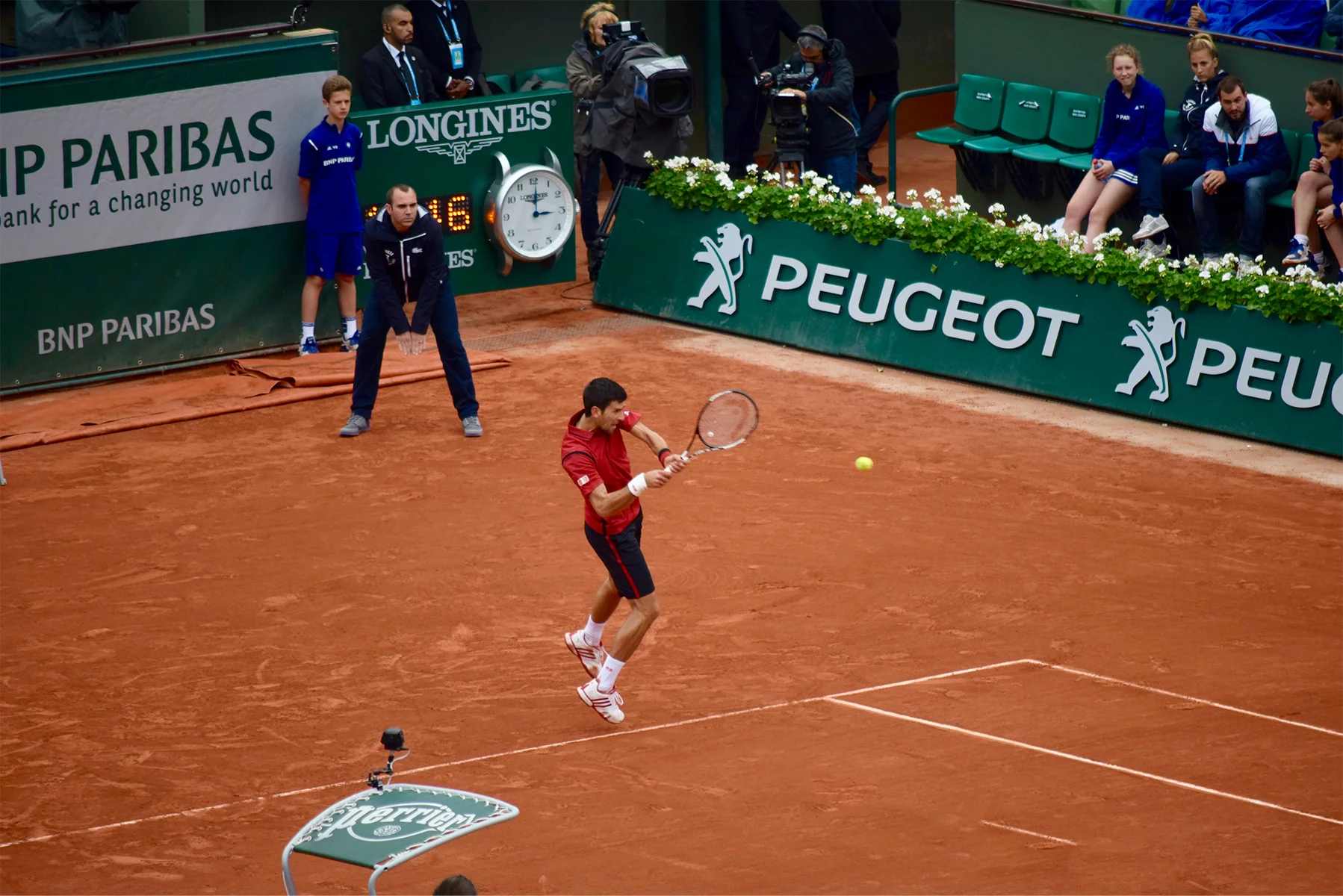 Novak Djokovic goes airborne as he hits ball. Photograph: Parisian Experience by Omnyview